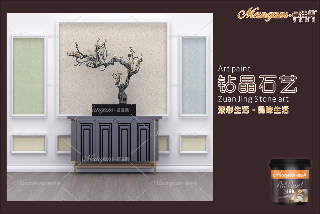 鉆晶石藝是一款由高級柔性丙烯酸乳液和精選優(yōu)質彩砂,配以高品質助劑調制而成,融合了真石漆和質感涂料優(yōu)點的砂壁狀高級裝飾涂料,也是曼佳美藝術涂料的新系列。精選彩砂的砂粒內部結構呈現(xiàn)多孔疏松,其結構對吸收乳液混合物有極大的幫助,加上砂粒內部疏松排布鏈狀相連能使乳液充分滲透到涂層,成膜后表面更加精密耐候。