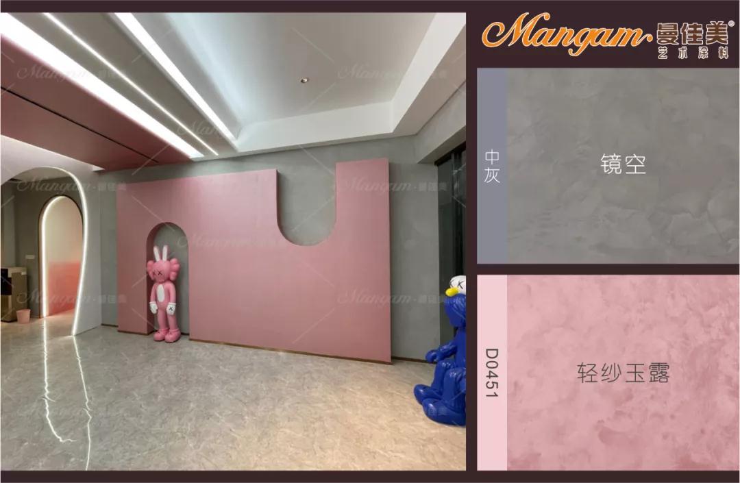 鏡空(中灰)冷靜而內(nèi)斂,輕紗玉露(D0451)柔美而活潑。鏡空(中灰)占主導(dǎo)地位,輕紗玉露(D0451)用作為提亮色,這兩款藝術(shù)涂料搭配,就像紳士和淑女的組合,驚艷而浪漫!