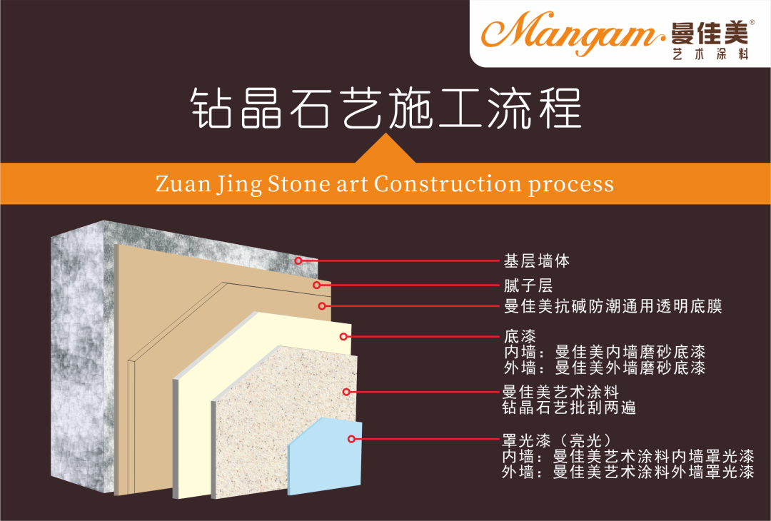 鉆晶石藝是一款由高級柔性丙烯酸乳液和精選優(yōu)質(zhì)彩砂,配以高品質(zhì)助劑調(diào)制而成,融合了真石漆和質(zhì)感涂料優(yōu)點的砂壁狀高級裝飾涂料,也是曼佳美藝術(shù)涂料的新系列。精選彩砂的砂粒內(nèi)部結(jié)構(gòu)呈現(xiàn)多孔疏松,其結(jié)構(gòu)對吸收乳液混合物有極大的幫助,加上砂粒內(nèi)部疏松排布鏈狀相連能使乳液充分滲透到涂層,成膜后表面更加精密耐候。