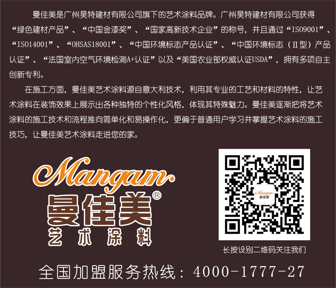 榮譽加冕,未來的曼佳美藝術(shù)涂料將不忘初心,以行業(yè)先行者姿態(tài)不斷前行,聚焦設(shè)計創(chuàng)新,推動行業(yè)發(fā)展,培養(yǎng)更多的技術(shù)工程師,研發(fā)更多的藝術(shù)涂料精品,為用戶提供更好的藝術(shù)涂料。