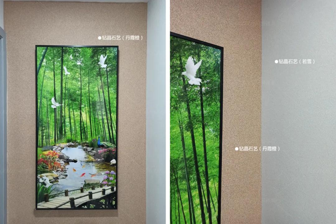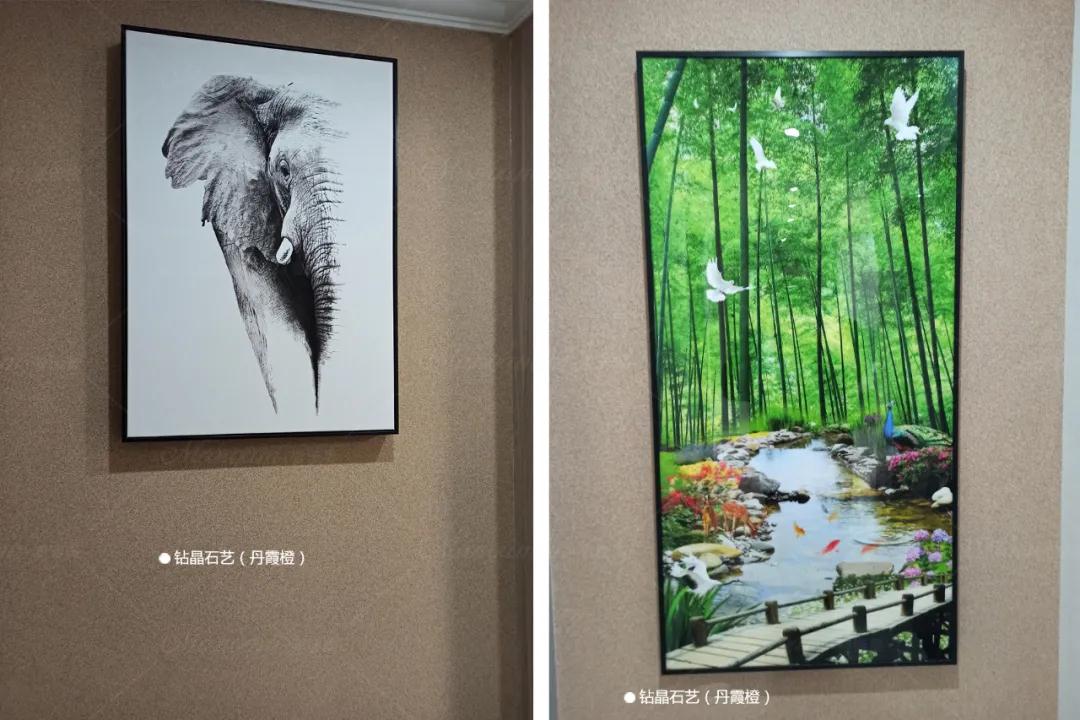 走廊兩面墻裝飾,大面積運用鉆晶石藝(丹霞橙/若雪),以及在走廊末端加了裝飾畫進行點綴。